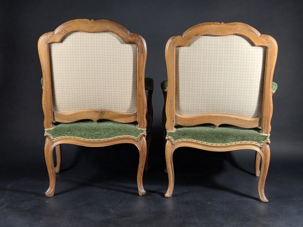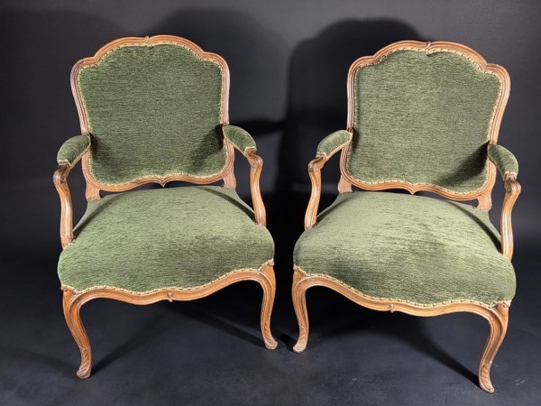 Paire de fauteuils en noyer à dossier à la Reine. Le dossier à épaulement et en accolade est mouluré avec une traverse basse chantournée. Descentes d'accotoirs galbées, traverses de ceinture chantournées soulignées d'un boudin sur le bord. Elles sont réunies par quatre pieds galbés feuillagés. Époque Louis XV, travail de la vallée du Rhône. Hauteur : 97 cm. Largeur : 65,5 cm. Profondeur : 59,5 cm.