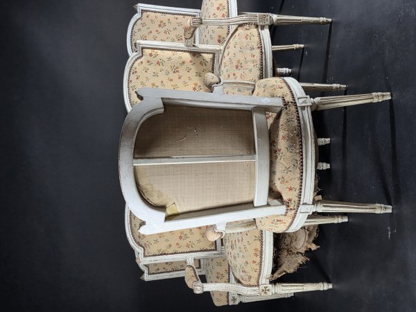 Suite de quatre fauteuils et deux chaises en bois laqué. Dossier en cabriolet à anse de panier. Dossier et traverses moulurés. Descente d'accotoirs moulurées, les dés de raccordement sculptés. Ils reposent sur des pieds fuselés à cannelures et rudentés devant. Époque XVIIIème siècle. Fauteuil, hauteur : 89 cm. Largeur : 56,5 cm. Profondeur : 52 cm. Chaise, hauteur : 87,5 cm. Largeur : 52 cm. Profondeur : 45 cm.