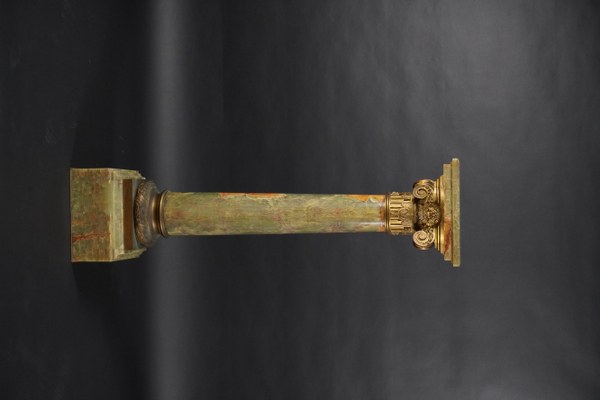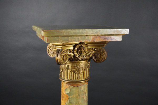 Colonne en onyx vert. Le plateau mouluré tournant est posé sur une un chapiteau ionique en bronze à décor de masques sur un fût en bronze à cannelures et festons. La colonne en onyx se termine par une base mouluré à décor de feuilles de laurier rubannées fixée sur un socle en onyx mouluré. Époque fin XIXème siècle. Hauteur : 117 cm. Côté : 31 cm. Petits manques.