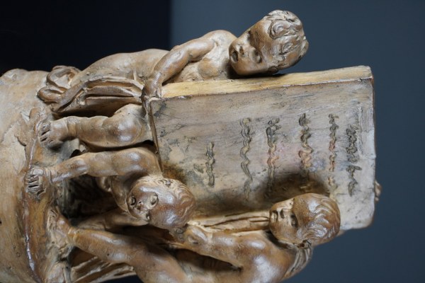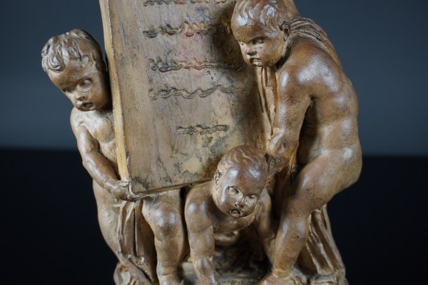 Louis-Félix De La Rue (1735 - 1765), attribué à. Etude pour un frontispice. Terre cuite originale. Porte une étiquette "V.S. N°47 / VASSE Louis Claude / (1716-1772) / élève de Puget et Bouchardon / Prix Rome 1739 / académie 1751 / Professeur 1761 / Salon 1748-1771". Porte un numéro à l'encre "B 47" sur le dessous. Hauteur : 20,5 cm. Provenance : Acquis en vente publique à Toulouse en 1954 ; collection particulière ; par descendance.