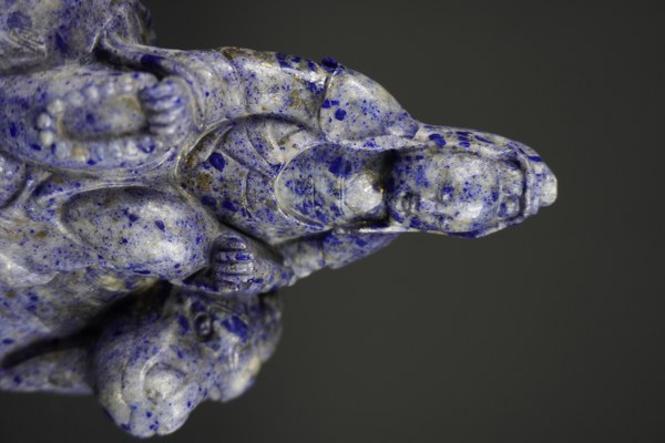 Statuette de Guanyin sur un animal fantastique en lapis-lazuli. Chine, travail du XXème siècle. Hauteur : 18,5 cm. Accident.