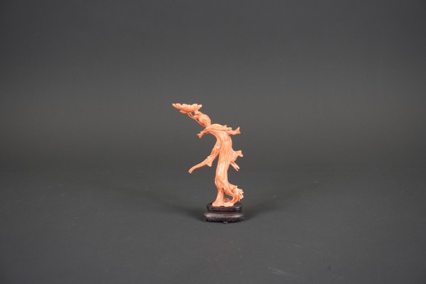 Petite statuette de femme en corail sculpté. Chine, XXème siècle. Représentée dansante, tenant une tige de lotus, vêtue d'une longue robe, socle en bois. Hauteur : 14,5 cm. Poids brut : 64 gr.