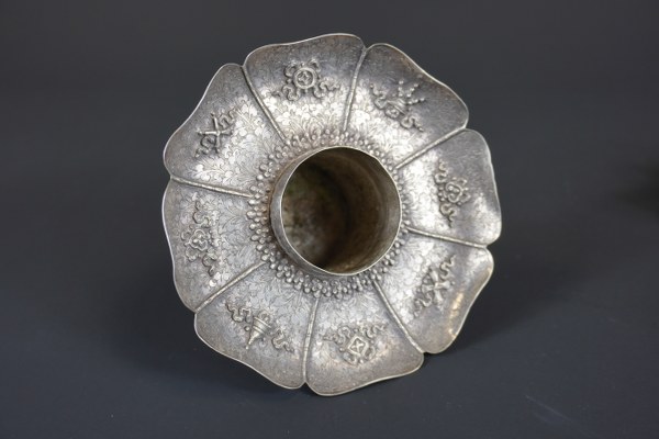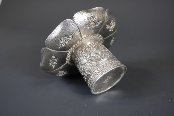 Coupe à beurre couverte en argent repoussé et pierre dure. Tibet, fin du XIXéme / début du XXème siècle. En forme de lotus, reposant sur un haut pied, ornée des huit emblèmes bouddhiques disposés sur les pétales gravés de rinceaux feuillagés, le pied décoré de branchages fleuris, le couvercle reprenant le même décor d'emblèmes. 14 x 13 cm. Coupe accidenté.