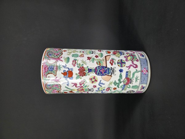 Vase cylindrique en porcelaine style famille rose. Chine, Travail moderne. Hauteur : 27 cm.