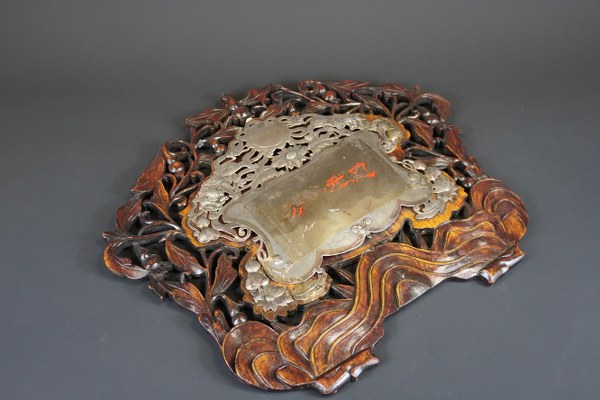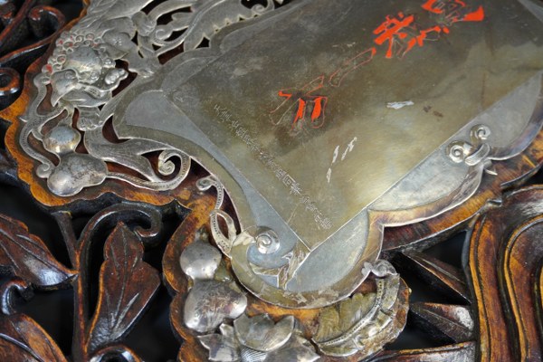 Plaque de gratitude en argent. Chine, début du XXème siècle. Offerte par le syndicat des hôtels de l'ancienne concession française de Tianjin, la partie supérieure orné de deux lions bouddhiques encadrant une perle, encadrement en bois sculpté de grappes de calebasse. 41 x 50 cm.