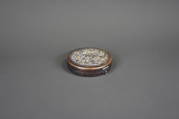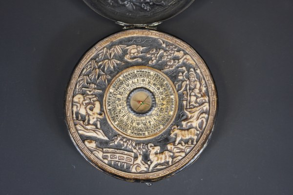 Boussole en métal repoussé et os. Chine, fin du XIXème / début du XXème siècle. Le couvercle de l'étui à décor d'oiseaux et fleurs, la boussole ornée de personnages et animaux, le centre inscrit de caractères chinois. 2,5 x 12 cm.