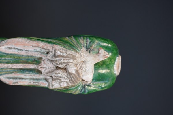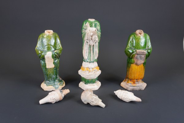 Trois statuettes de gardiens en grès émaillé vert. Chine, dynastie Ming, XVIIème siècle. Représentés debout sur des bases, vêtus de longues robes, coiffés de bonnets, l'un tenant un animal dans ses bras, têtes amovibles. Hauteur : 33 et 37 cm.
