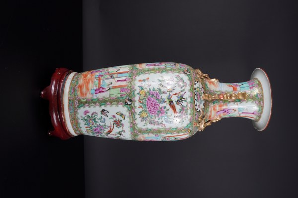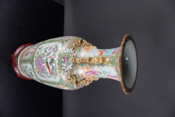 Vase de forme balustre en porcelaine de Canton, à décor polychrome de scènes de cour, fleurs, oiseaux et papillons. Chine, Canton, Vers 1900. Sur un socle en bois. Hauteur du vase : 62 cm.