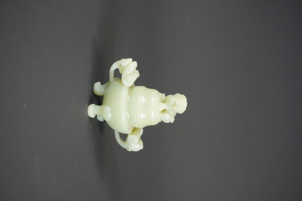 Petit brûle-parfum en jade ou serpentine (?). Chine, XXème siècle. La surface polie, agrémenté de deux anses en forme de lingzhi, le couvercle surmonté d'un lion. Hauteur : 11 cm.