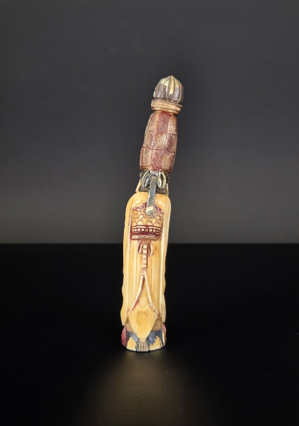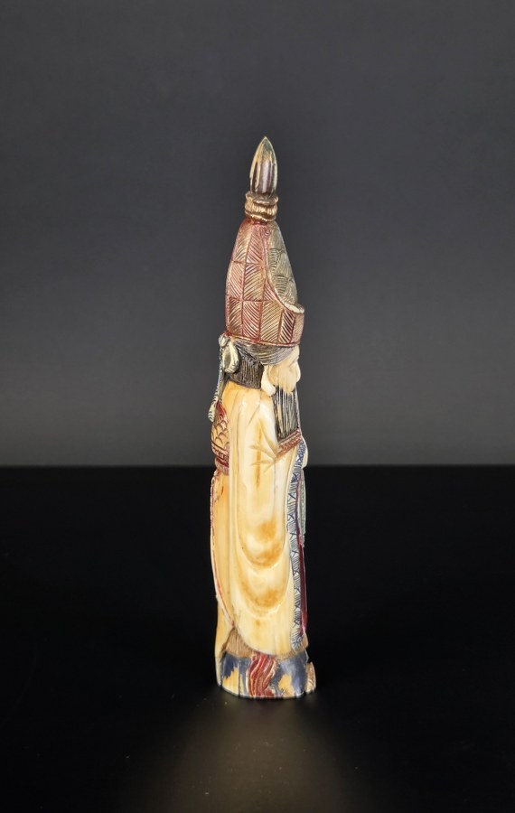 Japon, fin du XIXe siècle (Meiji). Okimono en ivoire d'éléphant polychromé représentant un notable de la cour impériale en grande tenue. Il tient une longue plume dans ses mains. Bonne fraîcheur des couleurs. Patine prononcée. Non signé. Hauteur : 17 cm. Poids : 143, 90 gr. N° CITES : FR2501400069K