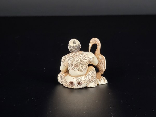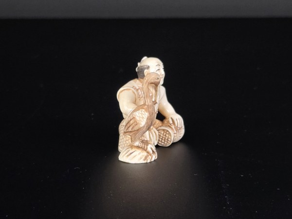 Japon, fin de l'époque Meiji, circa 1900. Netsuke en ivoire d'éléphant figurant un homme assis tendant une coupelle dans laquelle s'abreuve un ibis. Belle gravure monochromée du kimono. Signé sous la base Tomomitsu (famille Deme). Hauteur : 5 cm. Poids : 18,30 gr. N° CITES : FR2501400106K