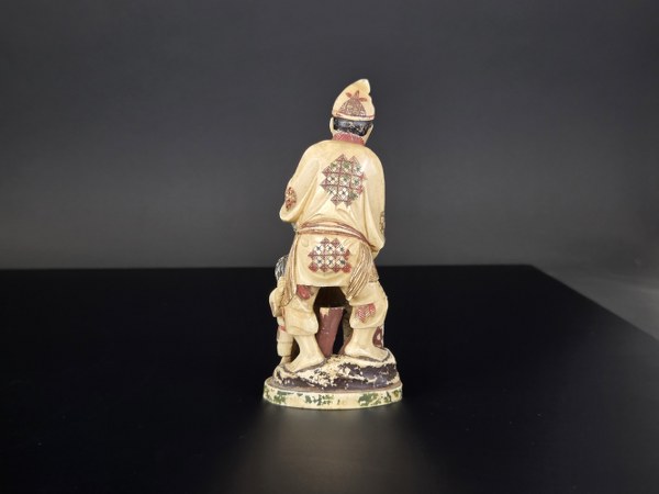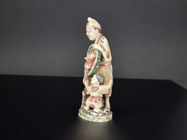Japon, début du XXe siècle, fin de l'époque Meiji. Okimono en ivoire d'éléphant polychromé représentant un pêcheur debout renversant un panier de poissons, accompagné de son fils. Signé sous la base Akimitsu. Hauteur : 14 cm. Poids : 202,10 gr. N° CITES : FR2501400108K.