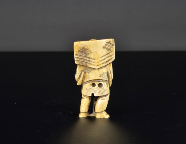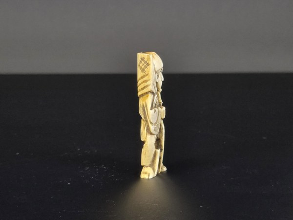 Japon, fin de l'époque Meiji, circa 1900. Netsuke en ivoire d'éléphant figurant un homme souriant s'appuyant sur un baton et retenant de la main gauche son grand col. Belle patine. Non signé. Hauteur : 5,5 cm. Poids : 12,75 gr. N° CITES : FR2501400107K