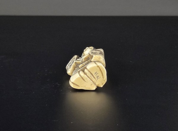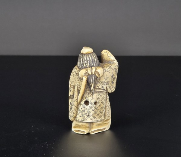 Japon, fin du XIXe siècle - début du XXe siècle (fin de l'époque Meiji). Netsuke en ivoire d'éléphant figurant un danseur de sambaro frappant sur un gong, visage pivotant sur un axe "la dualité de toute chose". Forte patine. Signé sous la base Gyokuichi. Hauteur : 7 cm. Poids : 48, 35 gr. N° CITES : FR2501400114K.