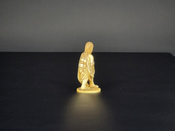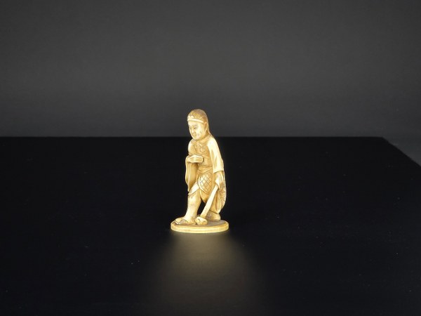 Japon, fin de l'époque Meiji, circa 1880. Okimono en ivoire d'éléphant représentant un moine tenant un ruy (bâton de prière). Signé sous la base Mitsumasa, école de Nagoya. Hauteur : 7 cm. Poids : 24,68 gr. N° CITES : FR2501400113K