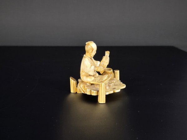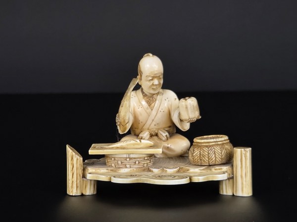 Japon, fin de l'époque Meiji, circa 1900. Okimono en ivoire d'éléphant représentant un poissonnier tenant un poisson dans sa main droite, assis derrière son étale et un autre poisson sur l'étal. Belle patine. Signé sous la base dans un cartouche de laque rouge Shimura. Restauration. Hauteur : 5,8 cm. Poids : 49,05 gr. N° CITES : FR2501400117K