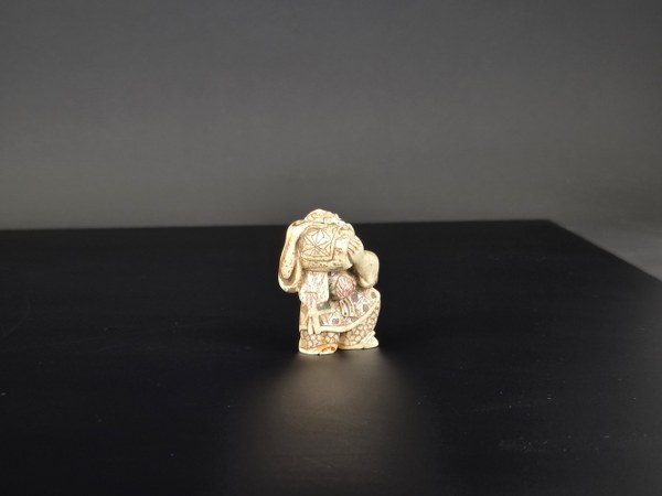 Japon, époque Meiji, circa 1900. Netsuke en ivoire d'hippopotame représentant un homme au tambour. Polychromie. Signé Yamaguchi. Hauteur : 3,7 cm. Poids: 32,38 gr.