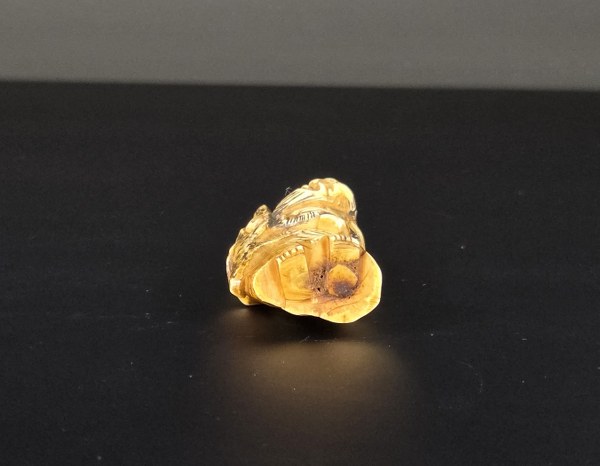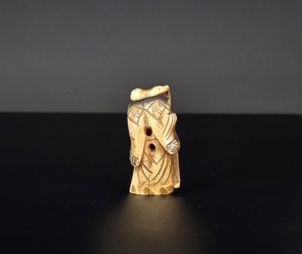 Japon, début du XIXe siècle (Edo). Netsuke en bois de cerf figurant un vieil homme à la tête penchée tenant un bâton terminé par une cabasse. Non signé. Hauteur : 5,5 cm.
