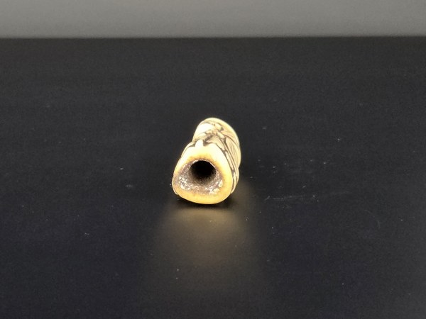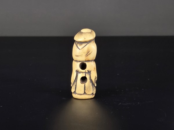 Japon, début du XIXe siècle (Edo). Netsuke en bois de cerf figurant un vieux sage s'appuyant sur un bâton. Hauteur : 5,2 cm.