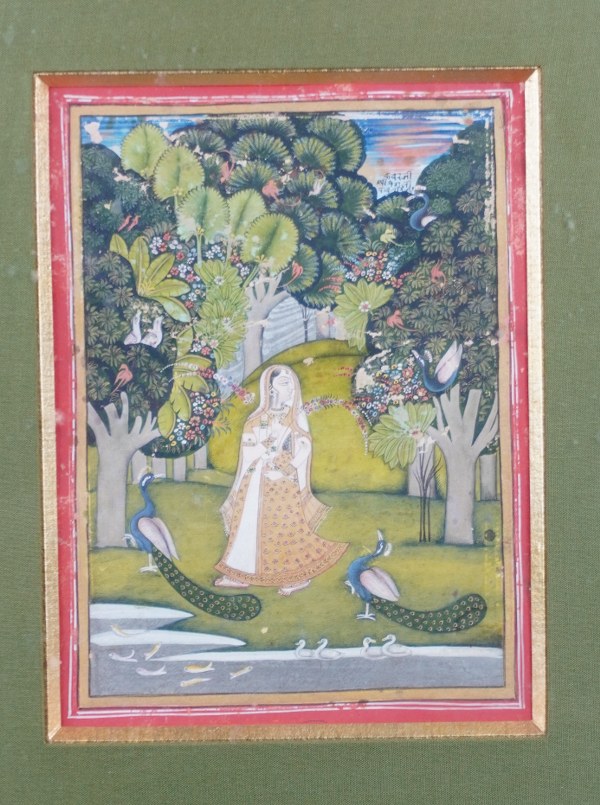 Illustration d'un Ragamala, Kakhuba Ragini, Inde du Nord, Rajasthan, fin XIXème siècle. Gouache, or et argent sur papier représentant, dans un paysage boisé aux arbres peuplés d'oiseaux, une femme debout tenant des guirlandes de fleurs dans les mains et encadrée de deux paons, une pièce d'eau poissonneuse et peuplée de canards au premier plan. Dans le ciel rougeoyant, inscription en devanagari à l'encre noire et scène ceinturée d'une bordure jaune et d'une marge rouge. Cadre. Dimensions à vue : 19 x 14 cm. Tâches, forte usure et accidents.