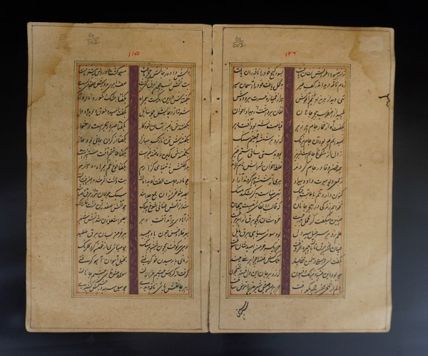 Deux folios illustrés, Inde, XXème siècle. Deux folios de manuscrit sur papier illustrés en pleine page à la gouache et à l'or, pour l'un d'une scène de chasse aux cervidés, pour l'autre une scène de femmes au puits abreuvant un cavalier. Chaque illustration surmontée de deux portraits d'homme et de femme dans un médaillon et ceinturée d'une marge à décor de personnages et d'animaux sur fond vert ponctué de fleurs dorées. Au dos, le texte de 17 lignes par page, réparti sur deux colonnes, en persan nasta'liq à l'encre noire. Au dos, illustrations. Dimensions à vue : 26 x 15,5 cm chaque page. Trous de vers, tâches, mouillures.