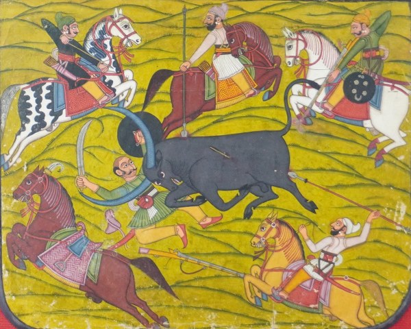 Scène de chasse au buffle, Inde du Nord, Rajasthan, fin XIXème siècle. Gouache et or sur papier représentant la traque d'un buffle par un groupe de cavaliers chasseurs armés d'arcs, de lances et de fusils, la bête figurée en train de charger un homme à terre armé d'un talwar. Sous cadre. Dimensions à vue : 24 x 29,5 cm Coins inférieurs rognés, usures, pliure.