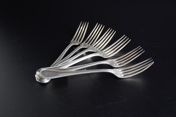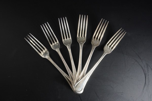 Six fourchettes en argent, modèle à filets, les spatules gravées du monogramme CP. Poinçon d'orfèvre : JG. Poinçon Minerve. Poids : 560 gr.