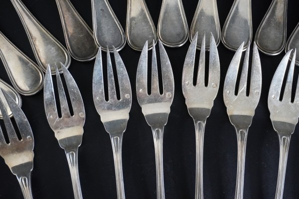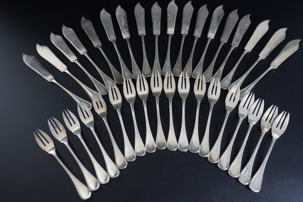 Partie de service à poisson en argent comprenant 18 fourchettes et 18 couteaux. Modèle à filets, les spatules gravées d'armoiries. Poinçon d'orfèvre : JG. Poinçon Minerve. Poids : 2170 gr.