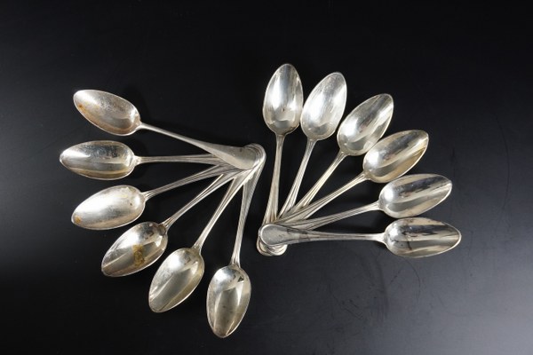 Douze cuillères à entremets en argent, dont onze modèle à filets et une d'une modèle différent. Les spatules gravées du monogramme CP. Poinçon d'orfèvre : JG. Poinçon Minerve. Poids : 1000 gr.