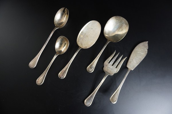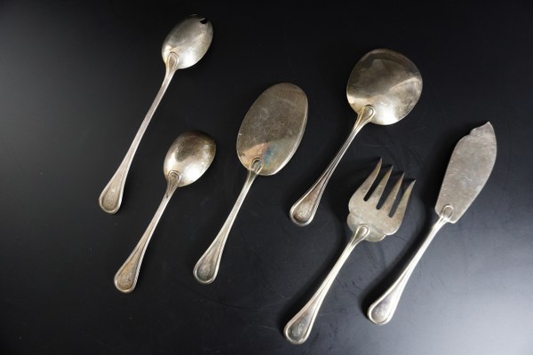 Ensemble de couverts de service en argent, modèle à filets, les spatules gravées d'armoiries et du monogramme CP pour l'une. Poinçon d'orfèvre : JG. Poinçon Minerve. Poids : 680 gr.
