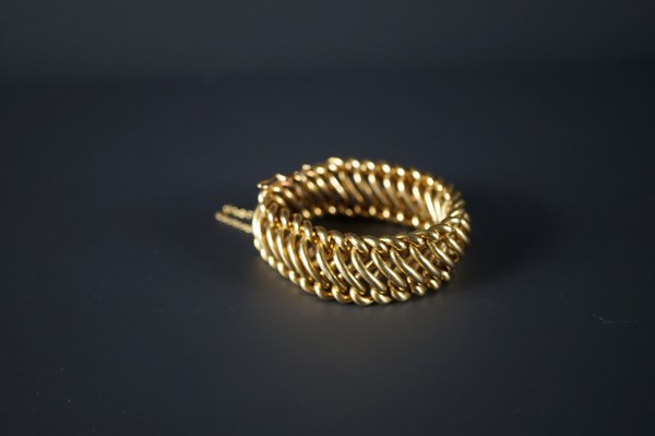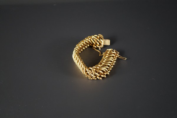 Bracelet en or jaune (750°°°) à larges mailles. Fermoir à cliquet avec chaînette de sécurité. Poids net : 46,4 gr.