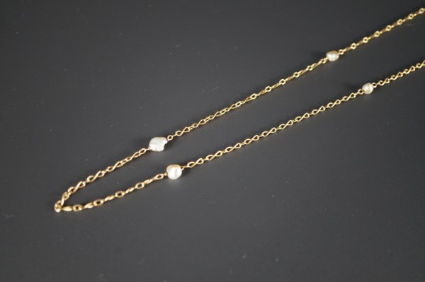Chaîne de montre formant sautoir, scandée de perles. Longueur : 154 cm. Poids brut : 28,3 gr.