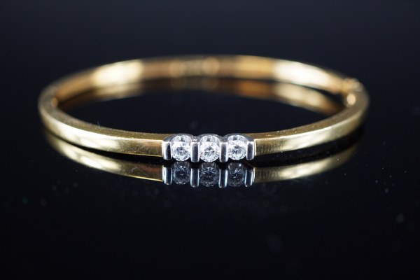 Bracelet en or jaune (750°°°) orné de trois diamants (environ 0,20 carats chacun). Poids brut: 10,8 gr.