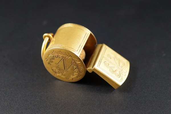 Sifflet en or jaune (750°°°) à décor gravé du N de Napoléon sommé de la couronne impériale et inscription "Les artistes et le personnel de Madame Sans-Gêne. Poinçon tête d'aigle et poinçon d'orfèvre. Poids brut : 20, 2 gr. Longueur : 3,5 cm.