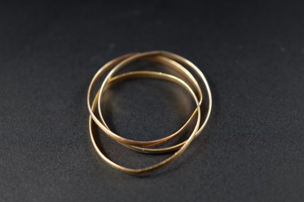 Alliance triple anneaux de trois tons en or (750°°°). TDD : 59. Poids net : 1,6 gr.