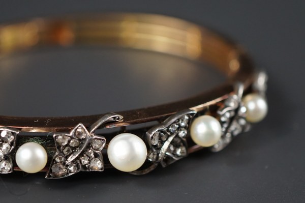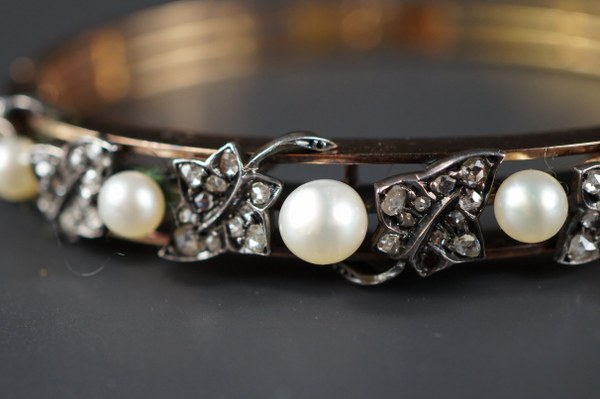 Bracelet jonc or jaune (750/°°°) composé de trois fils d'or rigides et orné de six feuilles de vigne pavées de diamants taille rose, alternées de perles. Ouverture possible par trois fermoirs cliquets. Largeur intérieur : 5,9 cm. Poids brut : 28,7 gr.
