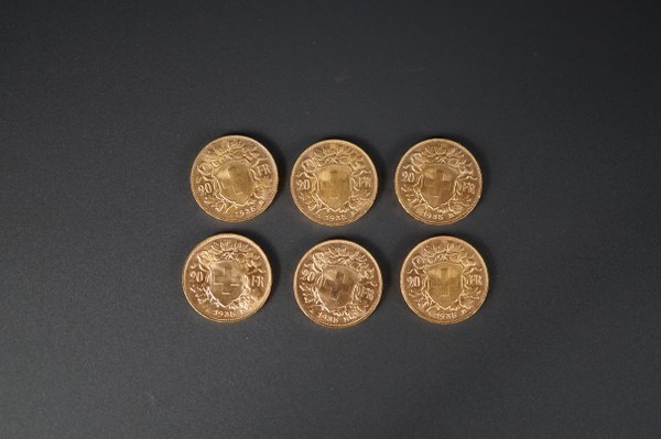 6 pièces de 20 francs or suisses.