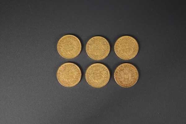 6 pièces de 20 francs or Napoléon III.