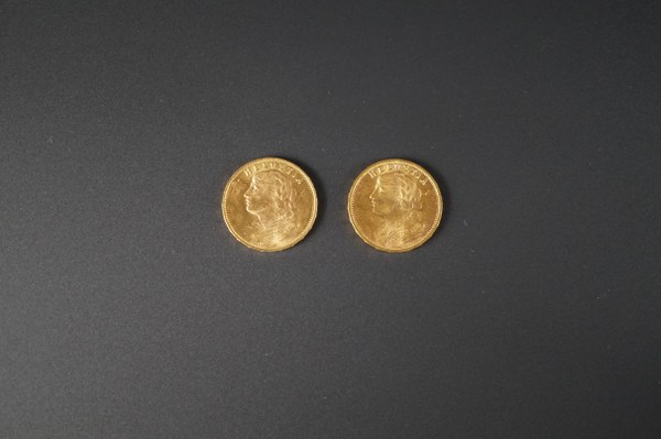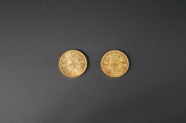 2 pièces de 20 franc suisse or. 1927 et 1930. Poids net : 12,9 gr.