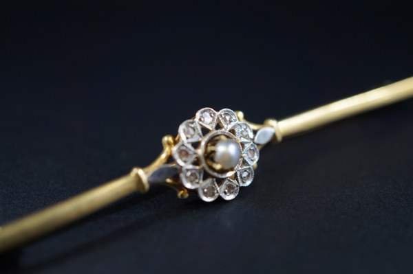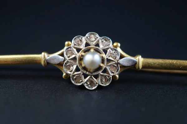 Une broche en or de deux tons (750°°°) centrée d'un motif floral sertie de pierres et d'une perle. Poids brut : 4,8 gr.