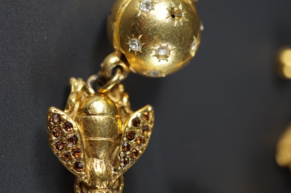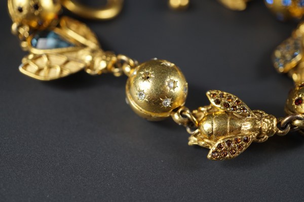 Bracelet en métal doré et strass de couleur à décor d'abeilles alternée de boules. Petits manques. Longueur : environ 20-21 cm.