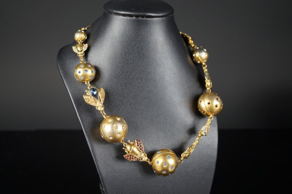 Collier en métal doré et strass de couleur à décor d'abeilles alternées de boules. Oxydations, petites usures. Longueur : environ 50 cm.
