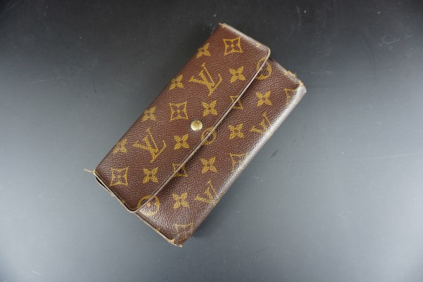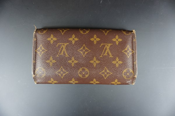 LOUIS VUITTON vintage. Poretefeuille en toile Mlonogram, fermoir pression sous rabat enveloppe, doublure en cuir marron. Usures, en l'état. Largeur : 18 cm. Hauteur : 10,5 cm.