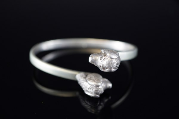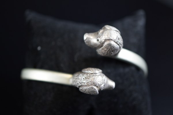 Bracelet en argent à double tête de chien. Poids : 67 grs.