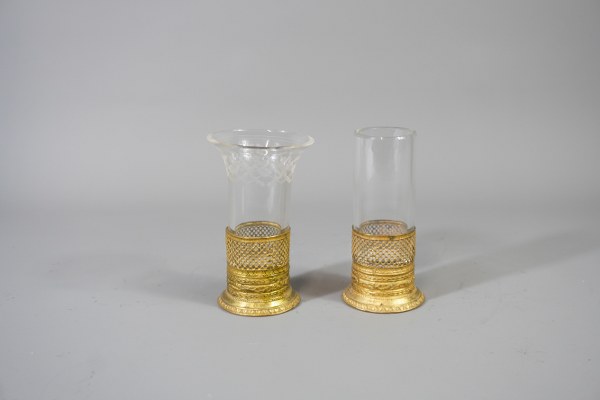 2 Vases en verre dont un cornet monture en bronze doré. Hauteur: 12cm.