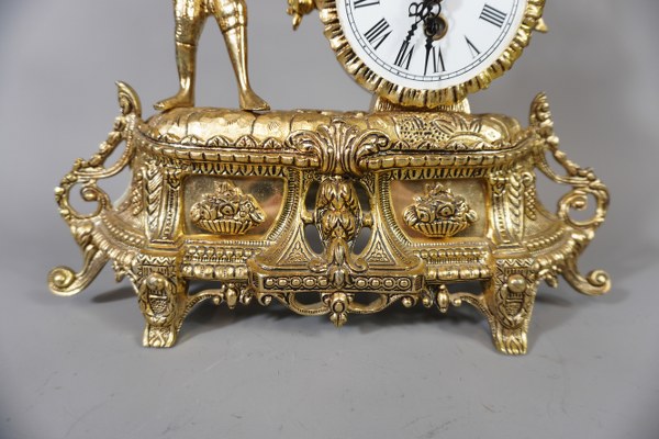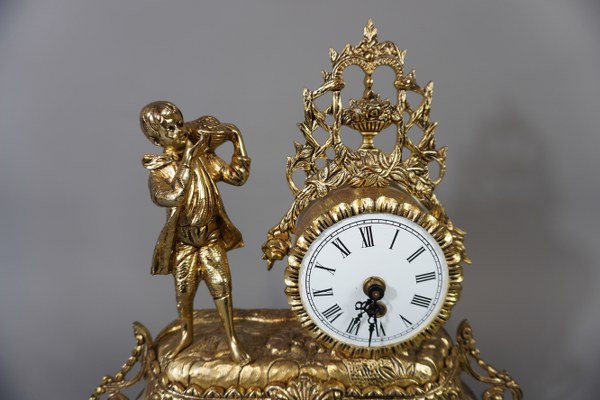 Pendule à décor d'un jeune homme portant un panier de raisin. Travail du XXe siècle. Fonctionnement non garanti. Hauteur : 35 cm.