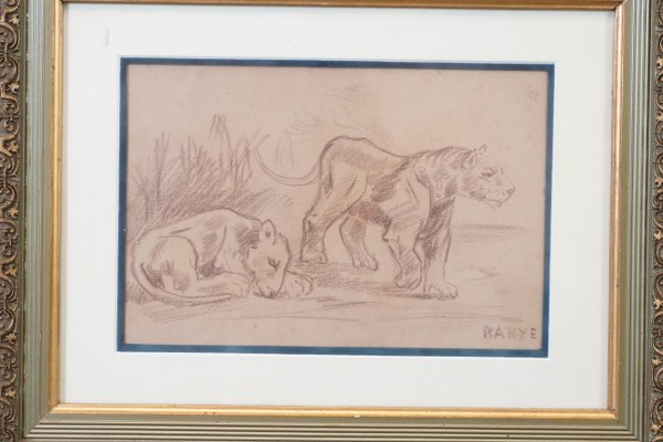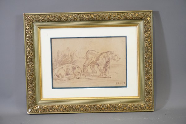D'après Barye. Deux lionnes, crayon sur papier. 17,5 x 27,5 cm.