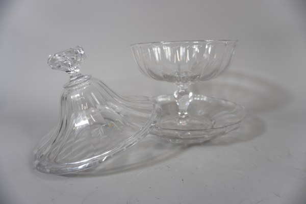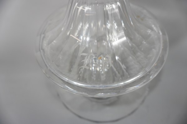Drageoir en cristal avec sa coupelle, monogramme gravé. Hauteur: 23cm. Traces de salissure.