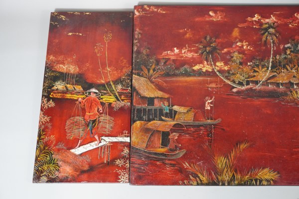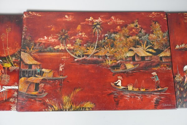 3 panneaux de laque rouge à décor de traversée de rivière et travail dans les rizières. Vietnam, XXe siècle. 41 x 61 cm et environ 40 x 19,5 cm. Accidents, manques.