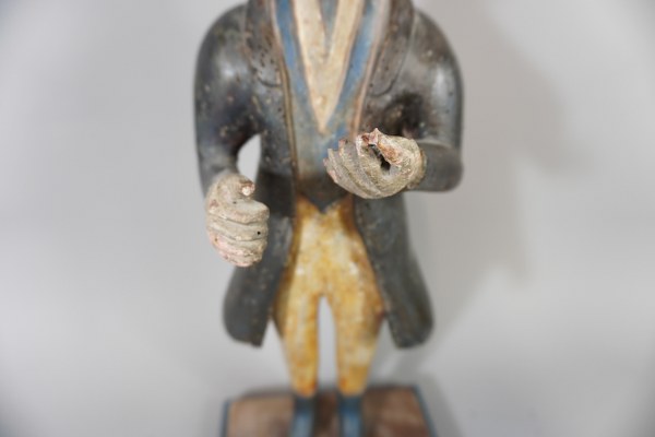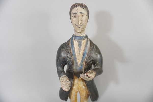 Sujet en bois figurant un gentilhomme à moustache, polychrome. Epoque XIXème siècle. Hauteur: 47 cm. Accidents et trace d'attaque xylophage.